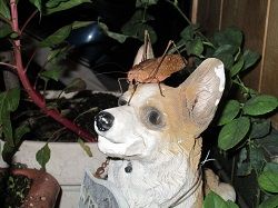 夜、虫の声が凄く大きく響き渡ってきて、どこから聞こえるのかとその声が聞こえる玄関の外側を見てみてびっくり。大きな虫が犬の置物の上に留まって鳴いていました。二女が調べてくれてクツワムシだということが分かりました。唱歌の「虫の声」のクツワムシはゆっくりの「ガチャガチャ」ですが、本物のクツワムシは強烈で超速い「ガチャガチャ」でした。