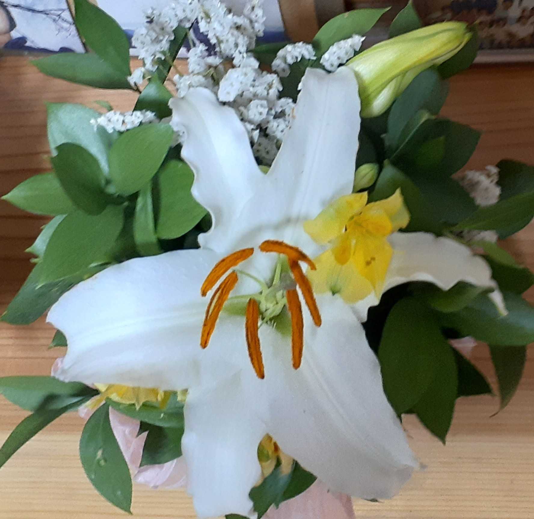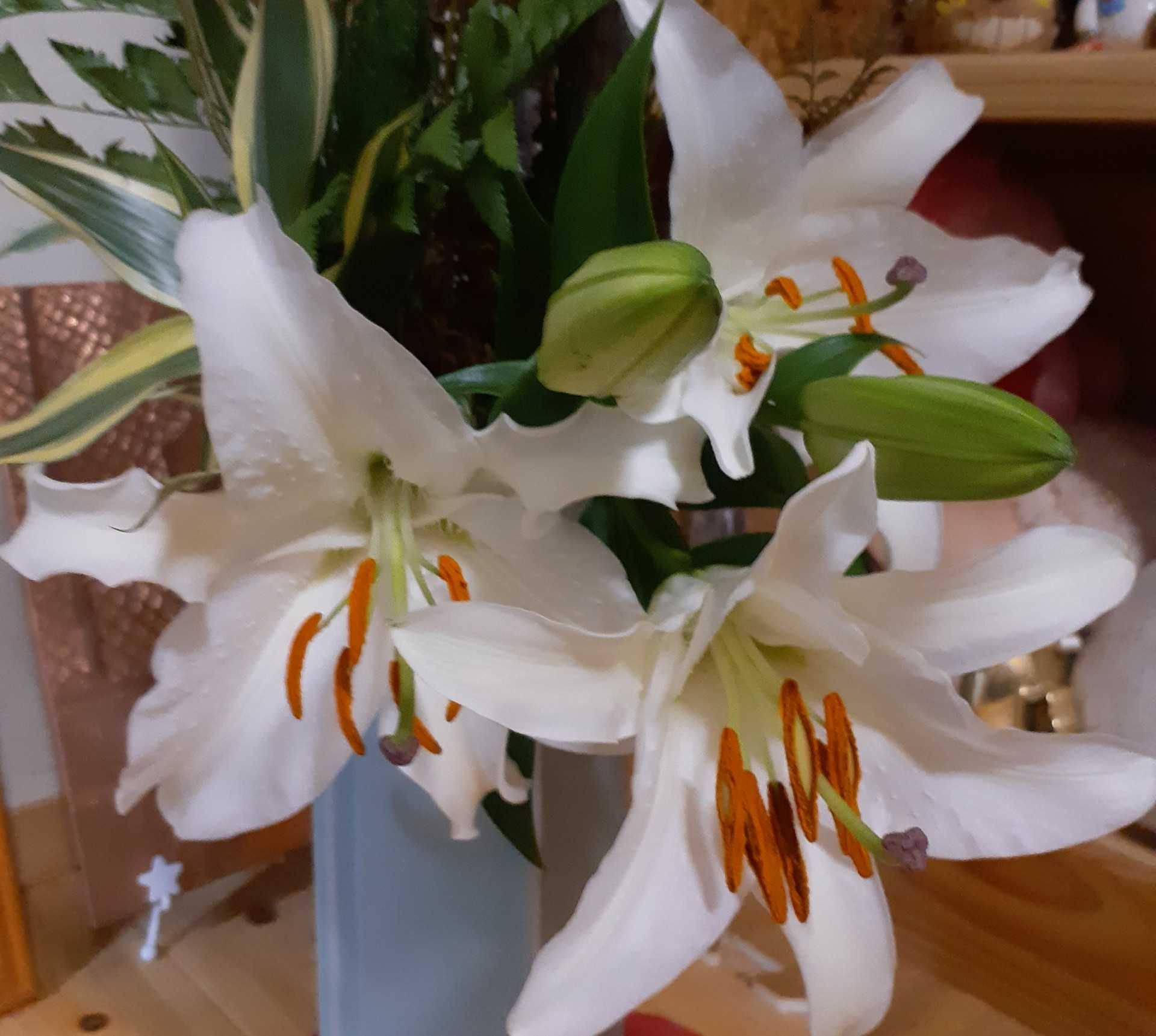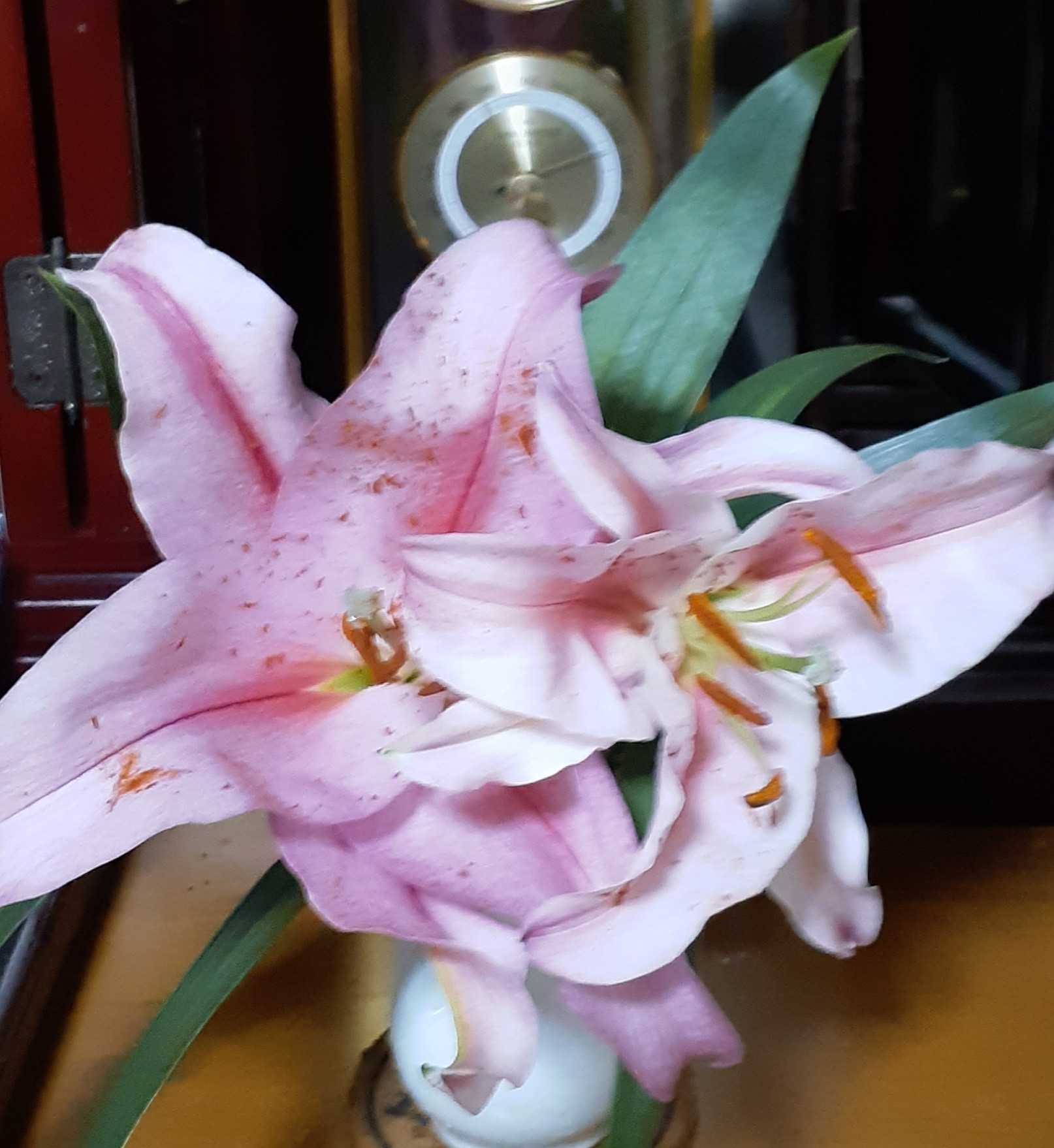 朝は高い山が雪で真っ白でした。午後は里も初雪でした。雪が沢山舞いました。暖は炬燵だけの居間、手が冷たいけれど、今日も書き物(嵯峨誌と硬筆)を頑張りました。写真は、生けた時は開きかけだったカサブランカの1日後と4日後(今日)です。