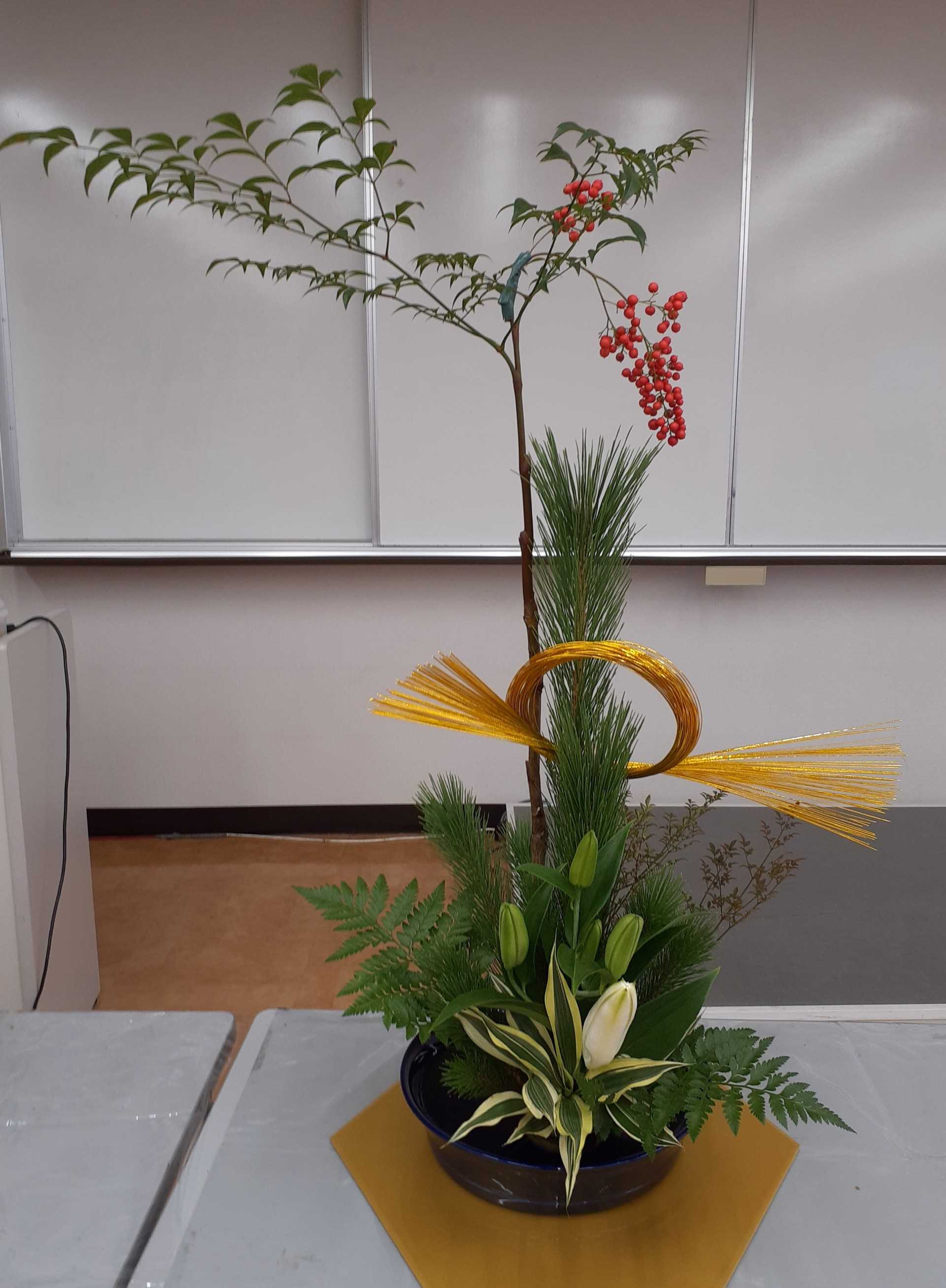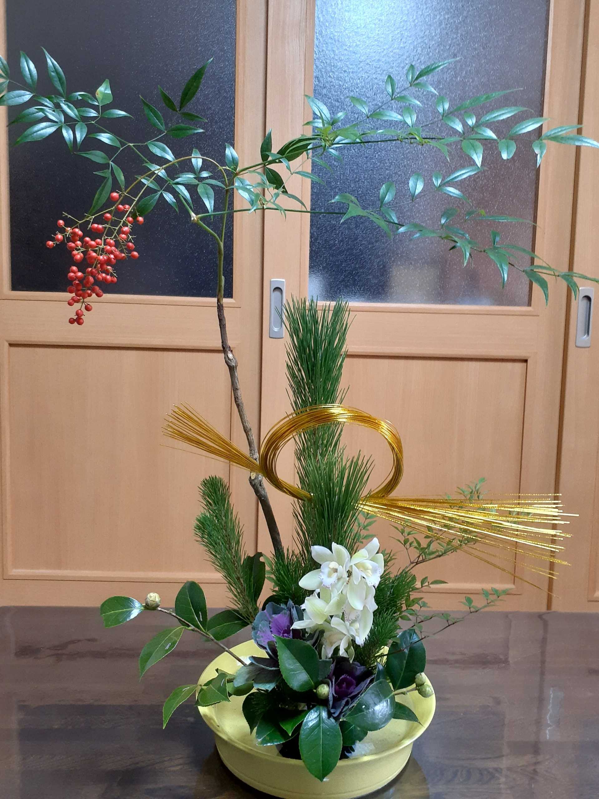 一昨日、久しぶりの花の稽古だったのに、餅つきのためにお休み。お昼過ぎに花だけ頂きに行きました。その花を今日やっと生けました。お題花の「実」です。2週間前の研究会で生けた時と同じ花材は南天と松と姫南天で、後3種類の花材が違っていました。何とか生けたのですが、これでいいのかどうか・・・です。