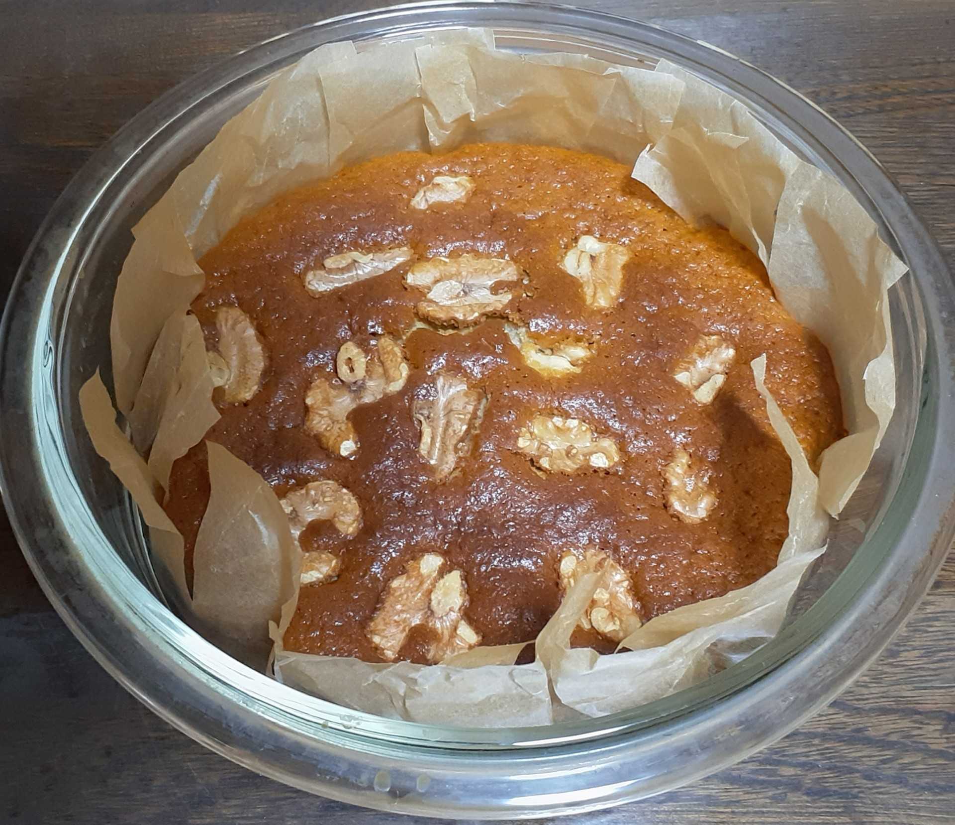 昨日のお菓子作りレッスンで教えていただいたケーキを作ろうとして、あったはずのパウンド型が見当たらず・・・。仕方なく円型で、ジャムはブルーベリージャムを使い、その他の材料や分量は教えていただいた通りで、胡桃を載せて焼きました。焼き上がって食べてみると、とても美味しかったです。