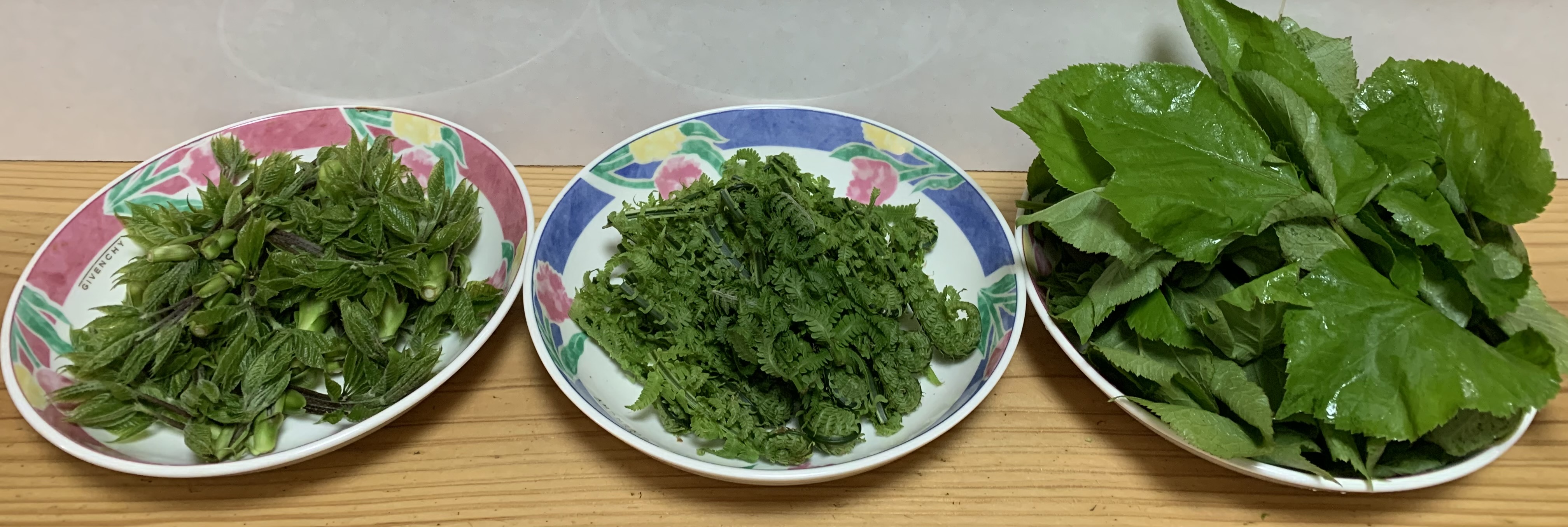 夕方、山菜3種の天ぷらを揚げました。昨日、深淵(東祖谷)の主人の友人がコシアブラ(写真上の左)とコゴミ(中)を届けてくださいました。その2種とうちのウドの葉っぱも……。時間がかかりましたが、美味しく揚がってよかったです。