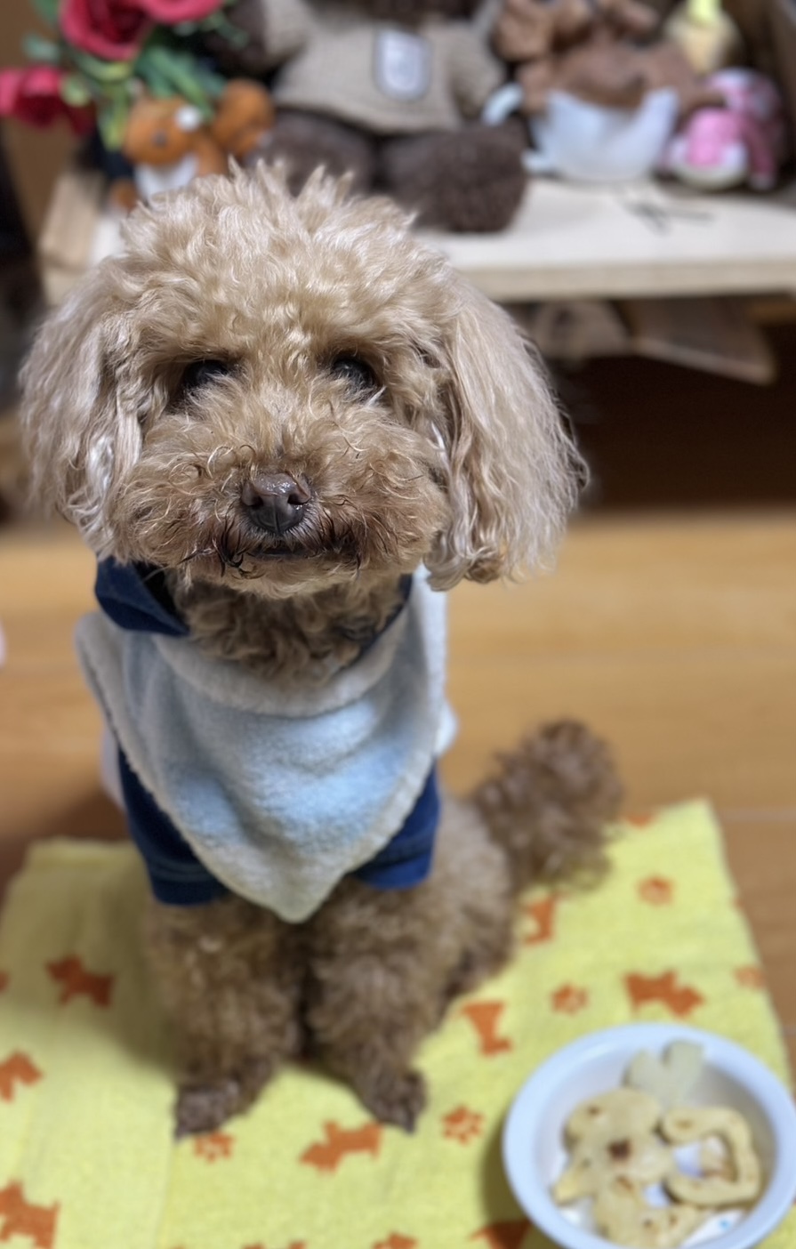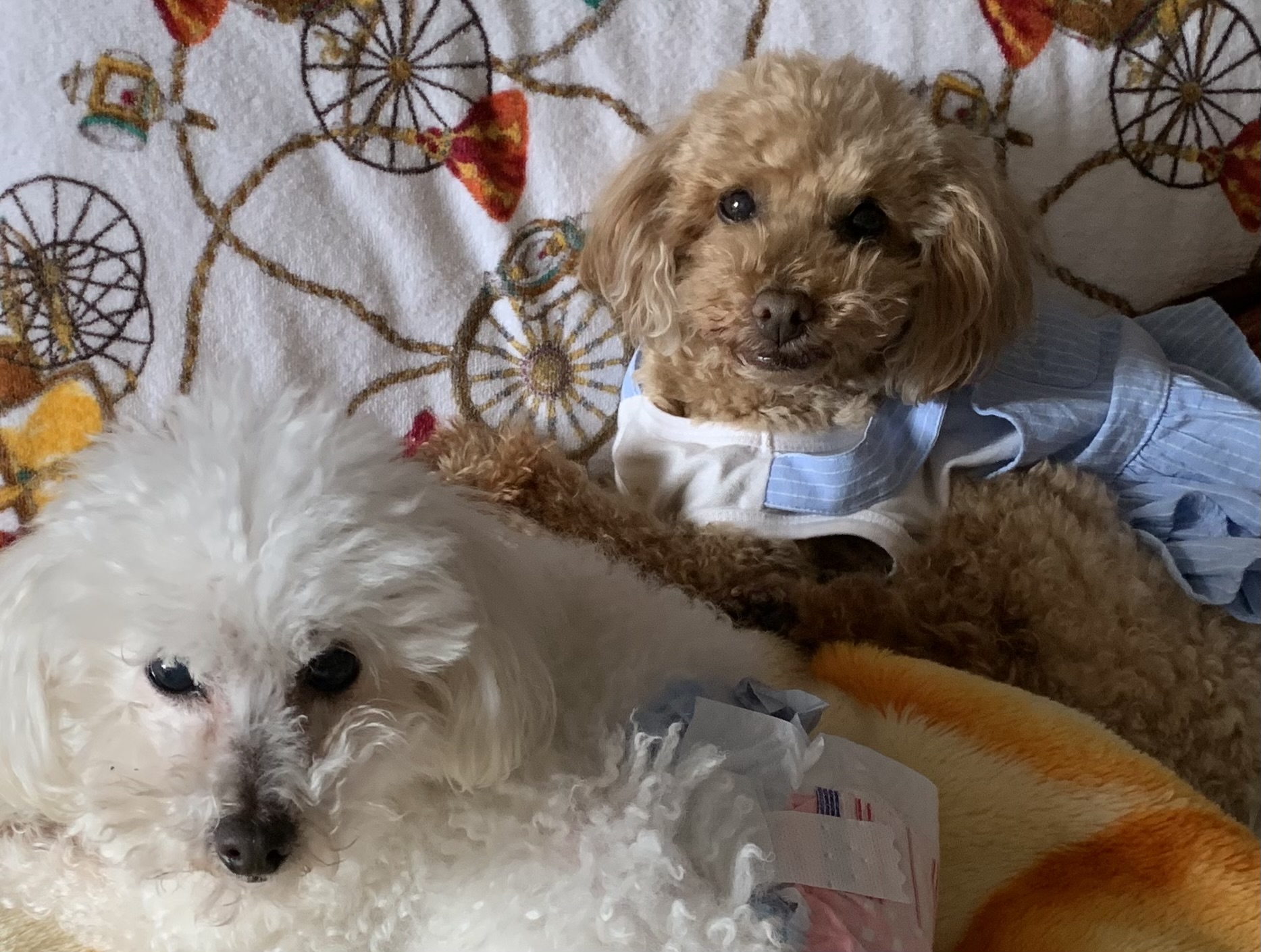 お泊まりワンちゃんが2匹と夜までの預かりワンちゃんが1匹とモコ。みんなで4匹の可愛いワンちゃんたちに囲まれて幸せを感じます。お泊まりワンちゃんのうちの1匹は、飼い主さんご夫婦がアメリカの娘さんのお宅に行かれていて長いお泊まり。みんな大人しくて本当に可愛い子たちばかりです。