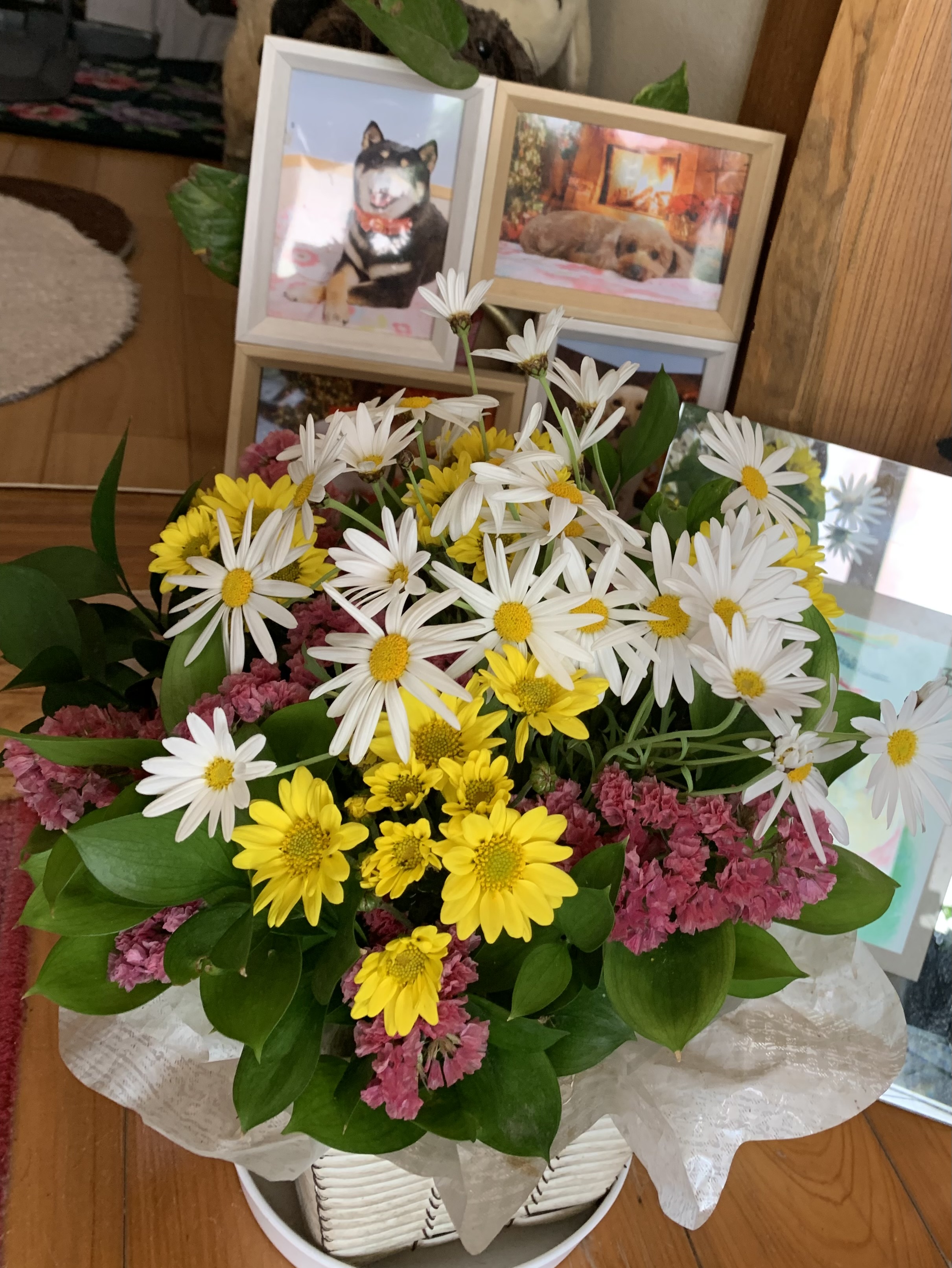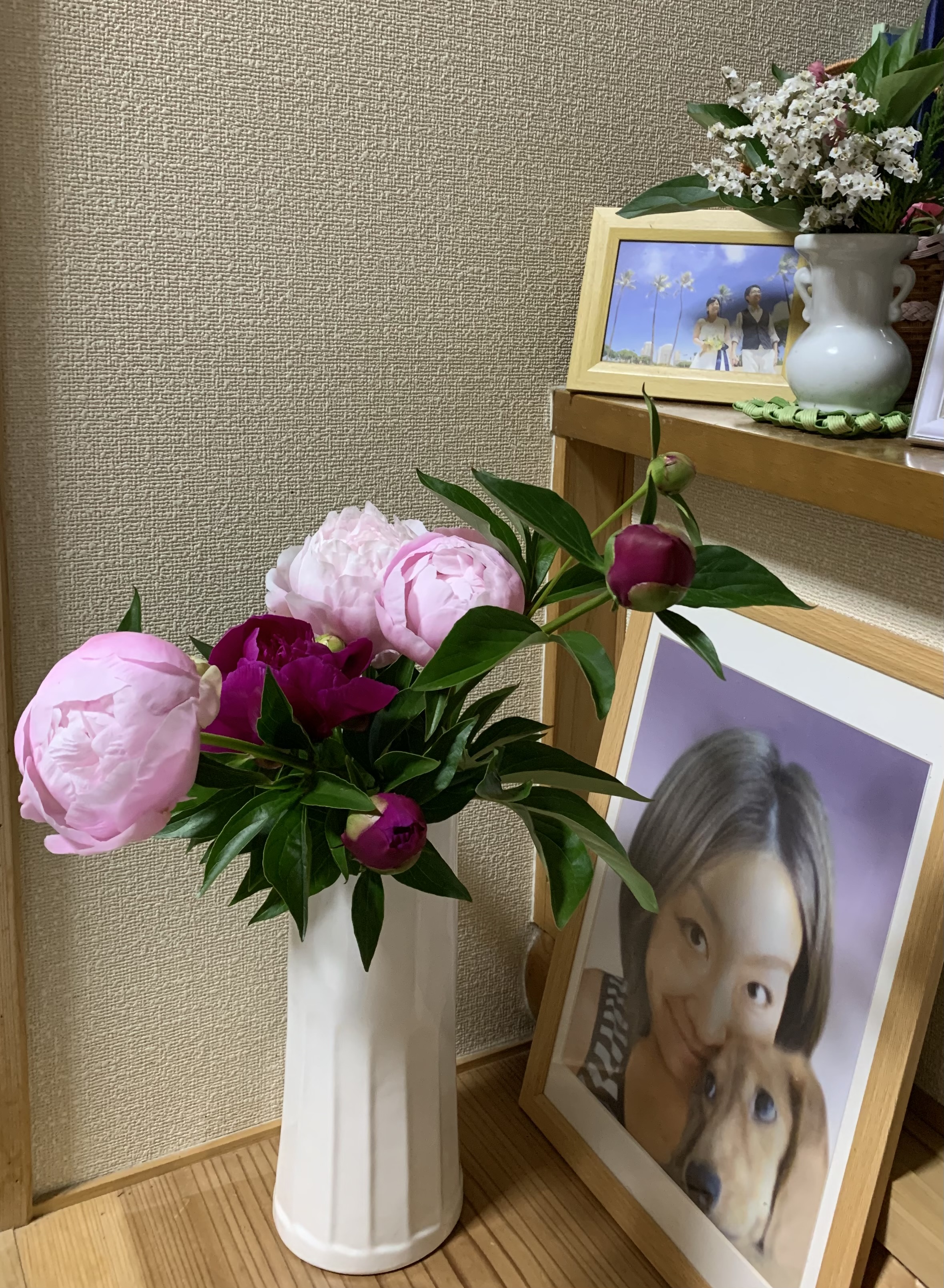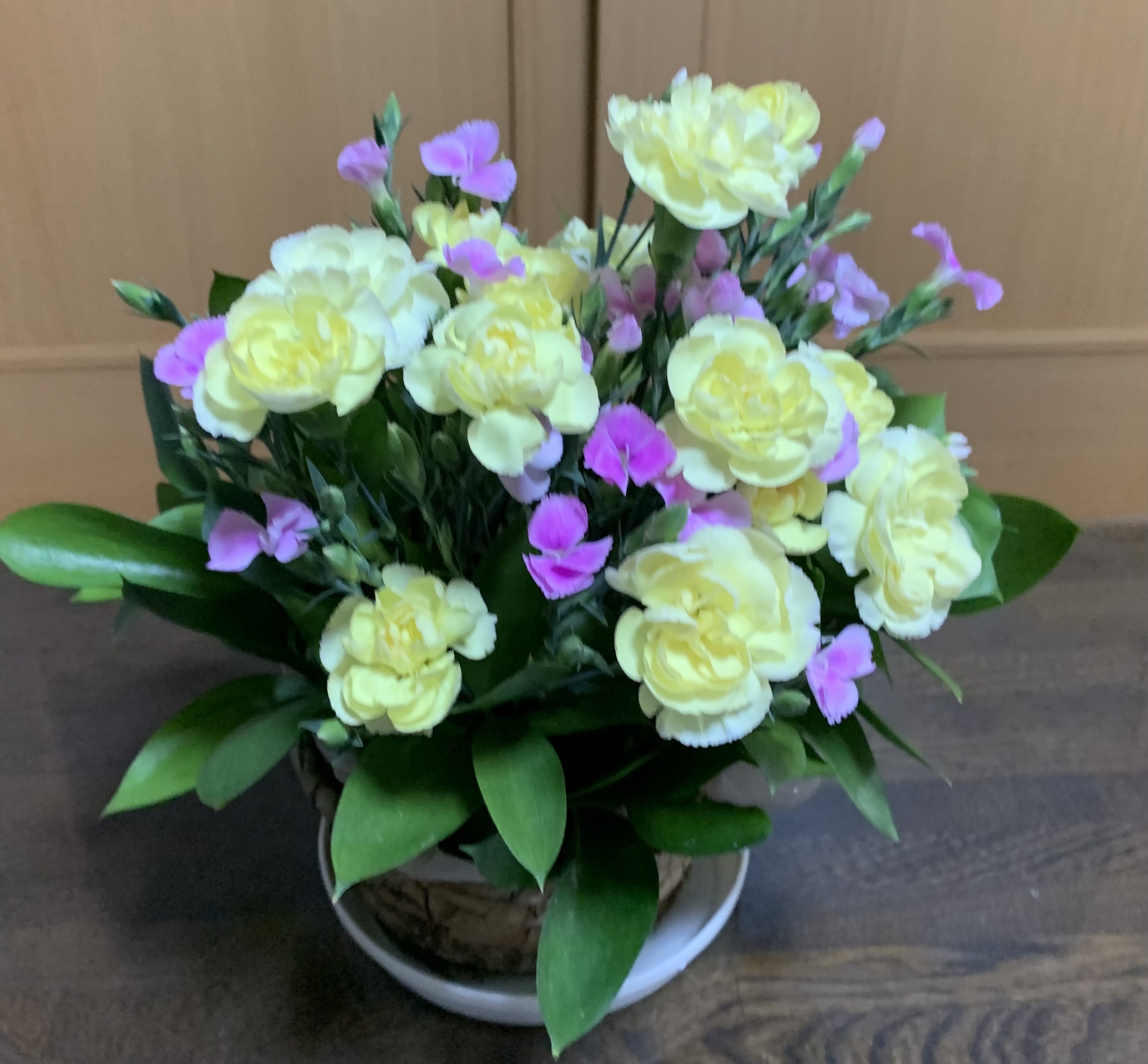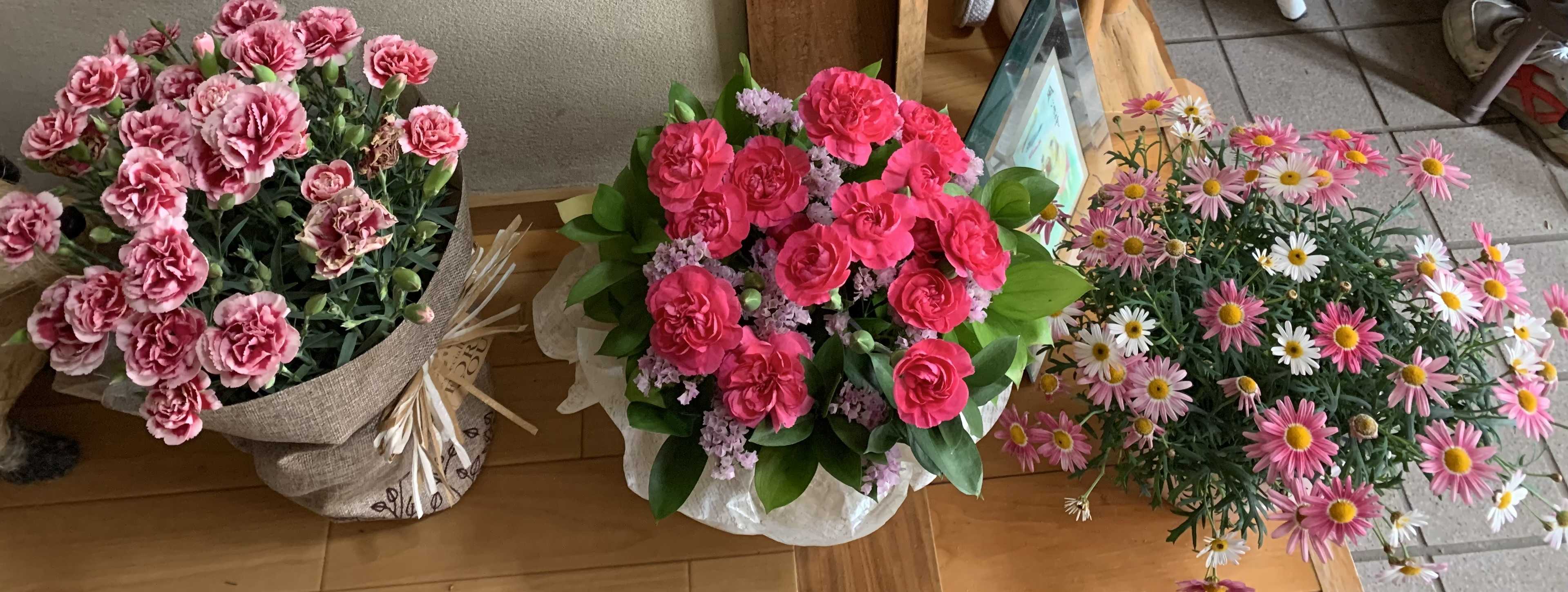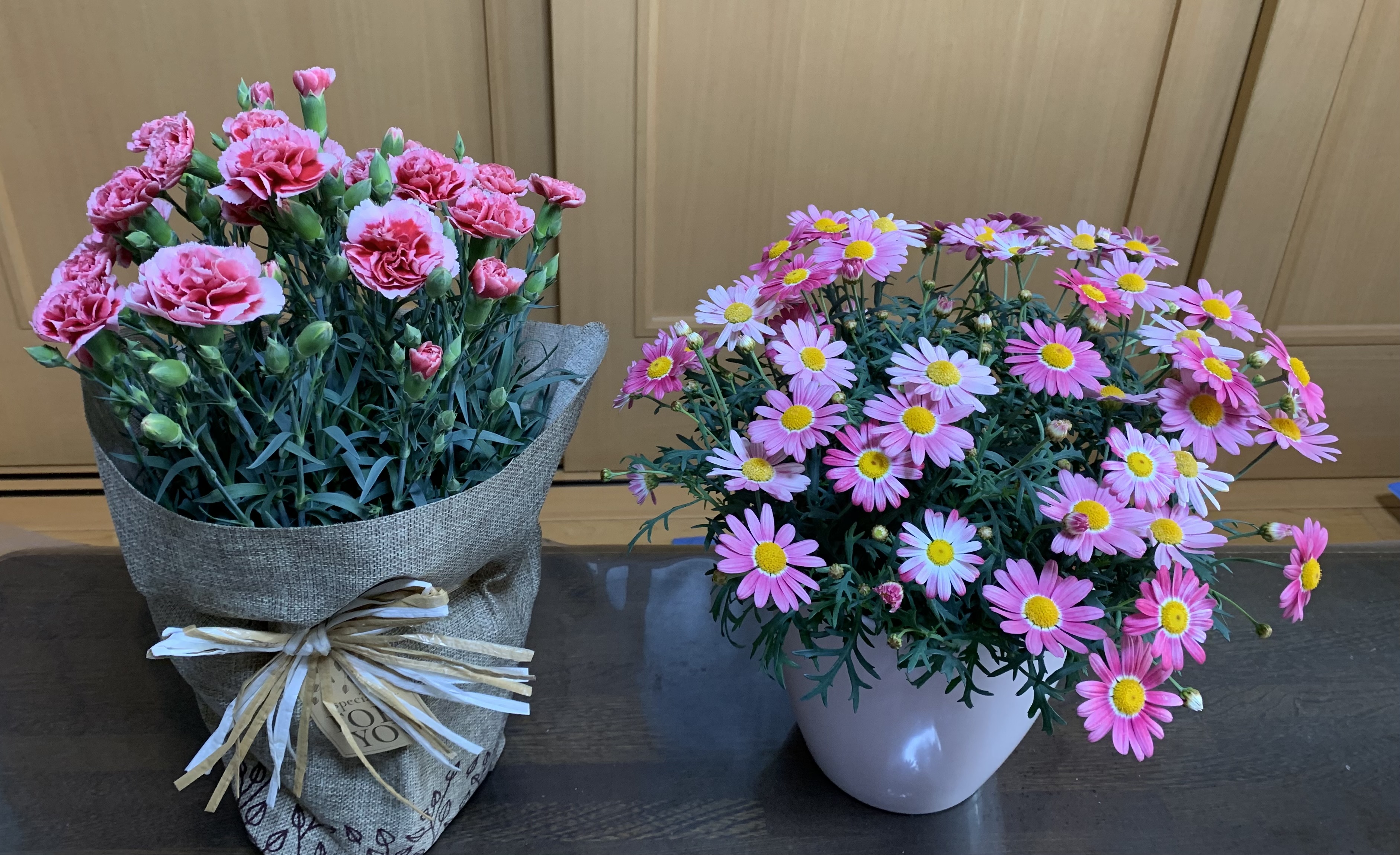 明日は母の日。1日前に、同時にお花が2つ届きました。長男からと三男からのプレゼントです。毎年、花が大好きな私のために2人ともお花を送って来てくれます。早速、玄関に飾りました。長持ちしてくれたらいいなと思います。