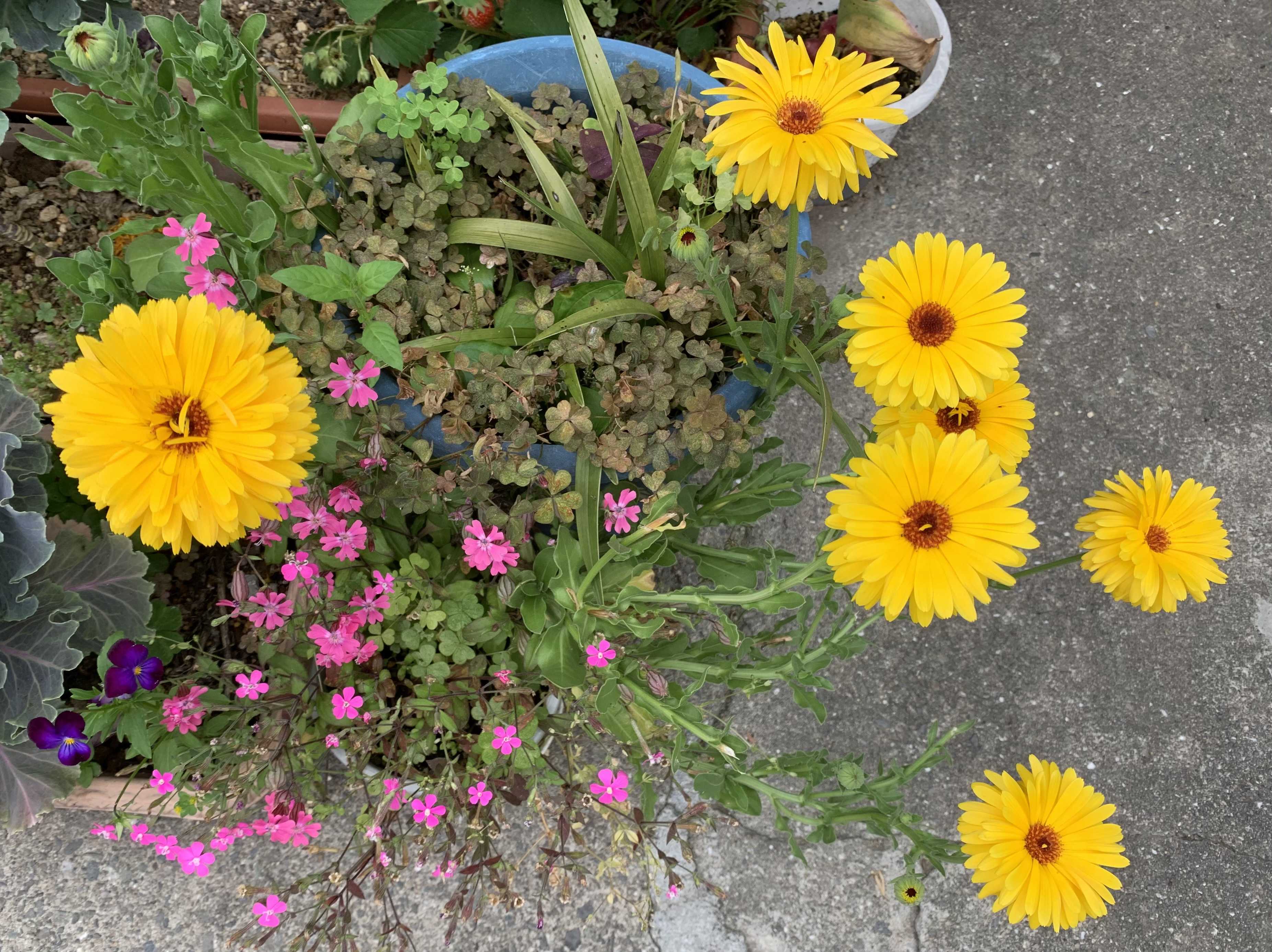 午前は多字数の仕上げ、午後はさおりロードの草抜きを頑張りました。草の中から、去年の百日草の「おろこばえ」(四国地方の方言で、種をまかなくても勝手に生えてくる植物、特にこぼれ種のことを指し、種が落ちて勝手に発芽し、生育している状態)があって植え替えました。後、土を入れて、種まきトレーで植え替えを待ってくれている苗たちを植え替える予定です。