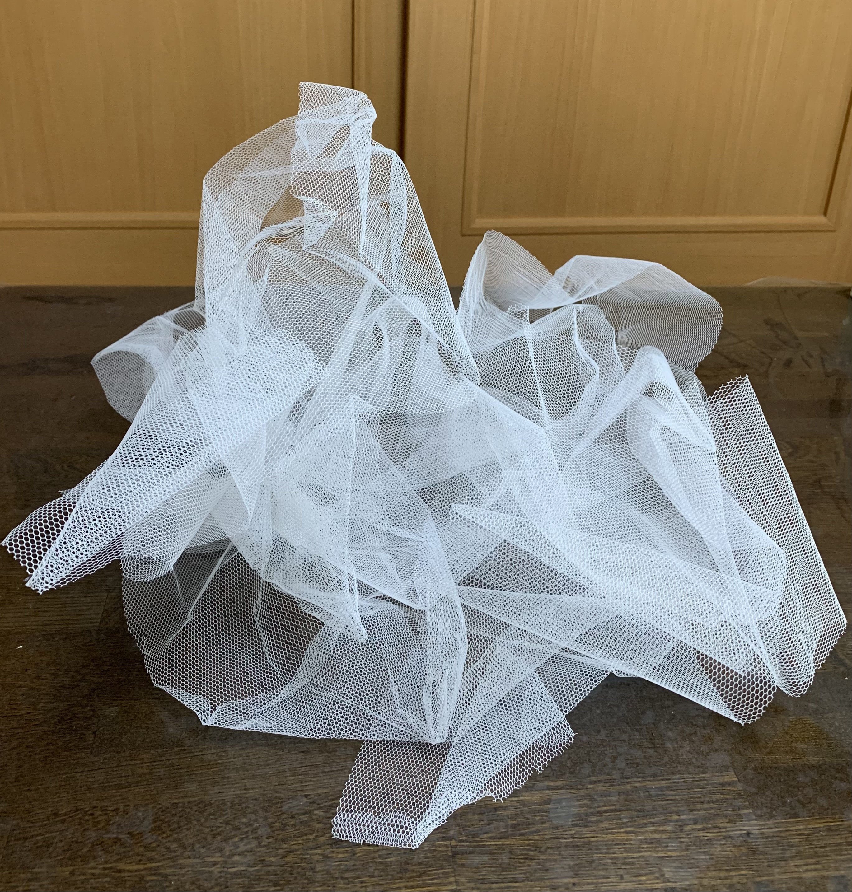 随分前に、パニエスカートを買って、長かったので切りました。その切れ端を大事に置いていました。今朝、主人に農作業用の網が破れたので修理してほしいと頼まれました。そこで、パニエの切れ端を使うことを思い付きました。超古いミシンの調子が悪く、凄く時間がかかってしまいました。でも、何とかできました。できることなら、新しいミシンが欲しいなあと切に思います。