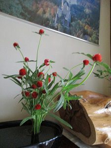 午後、友人Eさんが野菜と花を届けてくださいました。大袋の中にゴーヤ、キュウリ、ナス、ピーマン、スイカの数々が入っていて嬉しかったです。真っ赤なセンニチコウもとても嬉しかったです。帰られた後、早速、長女の前と玄関に生けました。