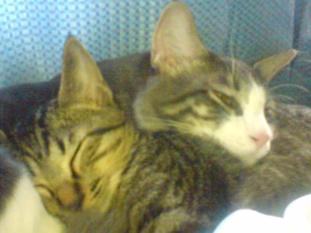 3匹目の猫 ナイト私が入院している間ナイトは自由奔放な猫に育っていたご飯の時間コスモが最初に《おすわり》と《お手》をして食べる次にギンガが《おすわり》《お手》をして食べるけれどナイトはコスモのご飯が出たとたんコスモより先に食べちゃうこれの躾には 苦労しました2ヶ月たって 今はちゃんと順番の待てる子になりちゃんと《おすわり》と《お手》も出来る様になりました《に~》《に~》これがナイトの鳴き方なんだか何処かで電池の切れ掛かったブザーが鳴ってるみたいこれは仔猫だからなのか・・・ナイトだからなのか・・・また、コスモみたいに去勢後に変わるかもしれないね我が家に来たときはギンガに仲良くしてもらえずコスモがお世話係りだったけれど何故だか今はギンガにベッタリギンガのする事を観察して真似してギンガの行く所には必ず着いて行く座椅子に座り(ほとんど寝転んでる状態だけど)テレビを見ている私の上にぴょん♪ と飛び乗ってくるそのまま背中をこすりつけ《抱っこしてください》の視線を送ってくるこれがナイトの眠い時なんて甘え上手なんだ~ねこじゃらしが大好きなナイト1歳を過ぎたコスモやギンガと違いまだまだ遊びたいさかり長い柄のついた ねこじゃらしを見つけると転げまわってネコパンチしたりカミカミしたり・・・よく私の膝に乗って ねこじゃらしを噛んでいるあまりにも爪がチクチク痛いので ねこじゃらしを少し離れた所に投げると急いで ねこじゃらしを追っかけていくしばらくすると またピョンと膝に乗って ねこじゃらしで遊んでる・・・・・あの~爪がチクチク痛いんですってば・・・・なので また ぽいっと ねこじゃらしを投げる慌てて取りに行くナイトでも やっぱりすぐ膝の上に戻ってきてる・・・どうしても膝の上で ねこじゃらしで遊びたいらしい・・・ぽいっ!トコトコ ねこじゃらしをくわえて戻ってくるぴょん♪ガジガジ チクチク ぽいっ!トコトコ ぴょん♪ガジガジ チクチク・・・・・あぁ エンドレス(^_^;)↓ギンガとお昼寝