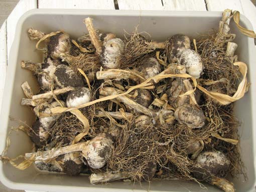 全部生き付いて、大きくなりました。気温が上り、軸が枯れたので収穫を行いました。写真は収穫されたニンニクです。