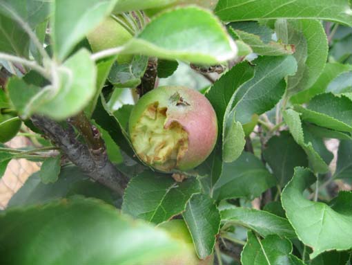 実がまだ小さいので安心していましたが、インコが2羽来て樹にとまっていました。調べてみると早くも林檎をかじり始めていました。急いで網を架けました。写真はインコに噛まれたちいさい林檎です。