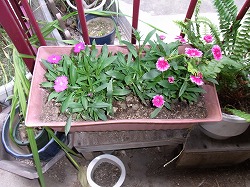 ナデシコはナデシコ科のカワラナデシコを指しますが、ナデシコ属の総称でもあります。秋の七草のひとつです。またカーネーションもナデシコ属の花です。近くの公園では四季折々の花が植えられ楽しませてもらっています。この花はボランティアの方が世話されています。市のほうから株が用意され植え替えがされています。中には花がまだ咲いているのに新しい苗が届き、古い花は処分されているようです。犬の散歩で公園に行ったら花の世話をしている方が、捨てるのがもったいないのでと言ってナデシコの株をくれました。大きな株になっていたので二つの鉢に植えました。12月半ば頃に植え替えて、正月を過ぎても元気で次々と花が咲いています。夏から秋に開花する花ですが、生命力があるのか、気候がおかしいのか、真冬にも蕾が付いて花が咲いています。冬場は花も少ないのですが次々と開花する花を楽しんでいます。三つの株は少しずつ花の色が違い、それぞれ楽しんでいます。、