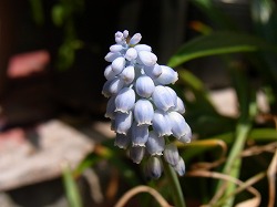 ムスカリはユリ科の地中海地方を原産とする花です。小さな壺状の花をぶどうの房のように咲かせます。青紫色の花を良く見かけますが、我が家のムスカリは薄紫色で濃い色ではありません。昨年夏に初めて球根を掘り上げて、秋に植え付けました。植え付けると間もなく芽が出てきて葉が伸びたのですが、寒さで葉先が枯れたようになり花が咲くのはあきらめていました。暖かくなっていつの間にか花芽が伸びて花が咲きました。球根が勝手に増えるようなので今年は掘り上げずに休眠させようかと思います。
