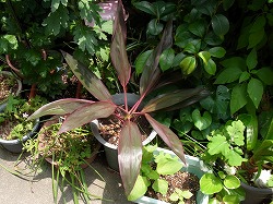 コルディリネはリュウゼツラン科の植物で熱帯アジア原産の観葉植物です。この仲間は20種類ほどあるようですが、その一つのレッドエッジです。緑色の葉の周囲に淡赤色の縁取りがあり、太陽に当てると葉の赤色が鮮やかになるようです。とある結婚式で頂いた花束の中に入っていました。花瓶に花束を入れていたところ、花が枯れてしまってもいつまでも元気な葉が残っていたので、水を換えようと抜いてみたところ、根が生えてきていたので植木鉢に植え替えました。花瓶の中でも根が生えてくるくらい強かったので、植木鉢に変えても元気に育つかと期待して植えたところ、期待通り枯れることなく、2カ月ほどすると新しい葉が出てきて成長してきました。真ん中に新しい葉が出てきています。今は他の木の下に置いてきつい日差しが当たらないようにしていますが、秋に入ったら陽が良く当たるところへ移動して葉の色が変化するのを楽しみたいと思います。いつものように植物の名前が分からず色々検索してやっと名前が判明しました。コルティリネ レッドエッジって見た目そのままの名前ですがいい名前です。
