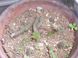 去年の11月に他所から貰ってきたビャクダンが冬を越して成長してきました。ビャクダンといっても香木のビャクダン(白檀)ではなく、サボテンの仲間です。貰ってきて鉢に植えたときの姿です。冬の間水やりを控え、暖かくなってきてから時々水をやっています。いつの間にか色もよくなり伸びてきています。放っておいてもよく育つようで、ものぐさにはもってこいの植物です。伸びてくると鉢からはみ出して垂れさがるようになり、花も咲くようなので成長が楽しみです。サボテンの仲間に嵌る人も多いようですね。棘も可愛らしく鮮やかな花が綺麗なので人気があるのでしょう。
