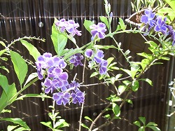 今年もデュランタタカラヅカの花が咲いてます。結構大株になってます。この花は紫色に白の縁取りがあって可愛い花です。放っておけばどんどん上に伸びていくので、伸びすぎた枝を毎年切っています。大きな鉢に植え替えているのですが、バランスが悪くなり、強い風が吹くと倒れてしまいます。切った枝は挿木に使います。去年切って挿木にしたものもしっかり根付き、今年の夏花が咲きました。またそのうちにどんどん成長して沢山の花が咲くと思います。