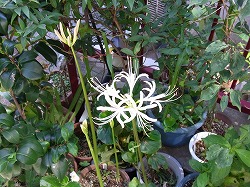 一昨年に株分けしたリコリスが元気に咲いています。去年は株分けした翌年で球根が充実していなかったのか、花も小さく数も少なかったですね。今年は花の茎も太く、大きな花がきれいに咲きました。秋のお彼岸の頃に咲く彼岸花、曼珠沙華とも呼ばれます。あぜ道に真っ赤な花が群生しているととってもきれいです。彼岸花類を総称して園芸上はリコリスと呼ばれるそうですね。我が家の花は赤じゃなくて白い花です。真っ白ではなく、少しピンクがかった薄い黄色っぽい色です。来年は今年咲かなかった球根も充実してもっと花が増えることを期待します。