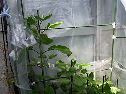 春に花芽が見えてきたと花を期待しましたが、暖かくなってくるとともに成長が見られなくなり、伸びかけた花芽も消滅してしまいました。本来12月頃に花芽が見えて成長するのですが、時期外れでやっぱり駄目でしたね。不安が大きかった期待でしたが不安が勝ちました。原因を考えてみたのですが、一つは時期がずれていたこと。もう一つは根元の方の茎がやせ細ってしまっていて栄養の吸い上げが上手くいかなかったことが考えられます。悪くなった部分を切ってしまい、新しい根が出るように挿木の状態にして回復を待つことにしました。同じような症状が出ることも多く、葉の育ち方が悪い時に根元の方を確認すると、地表5センチばかりがやせ細ってしまっています。このような時は悪い部分を切ってしまい挿木のようにしておくと新しい根が出て復活します。左端の背の高いものが復活した木です。夏に入るとすっかり元気を取り戻し、背丈は120センチほどになっています。1メートル越したのでこの冬は改めて花芽が期待できそうです。背丈の低いものも一時成長が悪かったので復活の荒治療を行って今では元気に育っています。