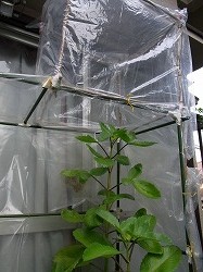 昨年の厳しい冷え込みを耐えてきたマザーリーフは、夏前に成長が悪かったので根元を確認したところ、茎の芯だけ残って周りがやせ細っていました。先端の葉が委縮したようになったり、先端の方の茎の伸びが悪かったりした時に、茎の根元を確認するとやせ細っている場合が多いです。こんなときはやせ細った部分を切ってしまい、改めて挿木するように鉢に戻します。そうすると茎の節になった部分から新たな根が生えてきて元気になってきます。今年はそのような株が沢山ありました。これらの鉢は夏の間にしっかりと成長して、ビニールハウスの中は混雑状態です。中でも一番背丈のあった株はハウスの天井に届かんばかりに成長しています。ハウスは180センチの高さですが、花芽が出てくるともっと高く伸びるので、ハウスの天井を半分破って付け足しました。ちょっと不細工ですが40センチほど余裕ができました。今のところ花芽の兆候は見られませんがこれで一安心です。夏の間空けてあった前面にカバーをできるようにすれば冬の準備は出来上がりです。ビニールハウスに入りきれない鉢もあり、今年になって葉から新たに成長した株も沢山あるので防寒対策を考えていかなければなりません。