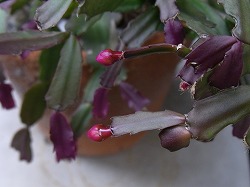 シャコバサボテンの花芽が出てきました。もう何代も代わってきた株です。毎年赤っぽく色が悪くなっていつもこれで終わりかと思っていますが、翌年には何とか枯れずに夏になると少し伸びて、冬になると弱々しく花芽が出てきます。戸外で置いたままなので、花芽が出てきても寒さのせいで花が咲かずに蕾が落ちてしまうこともあります。手入れもせずに放ってあるのですが毎年少しだけ花が咲きます。シャコバサボテンは短日性なので、一定の暗い時間があれば花芽が付きます。いつも明るい所に置いてあると花芽は付きません。