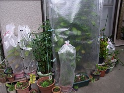 11月にもなると朝晩の冷え込みも秋の気配から冬の気配へと変わりつつあります。毎年マザーリーフの冬越しに頭を痛めています。家の中へ隔離できればいいのですが、置く場所も無いので戸外で防寒のためビニールで囲った簡易な温室を作っています。ここ2年ほどはもう少し持ちこたえてくれと祈る中、最後の冷え込みで若い苗が萎れてほぼ全滅状態になっています。20株近く作っているのに生き残るのは2鉢ほどというありさまで、春になっても体力が弱くてなかなか成長しません。夏になってやっと元気になってくるという状況です。今年の冬支度はビニールの温室の前面にプチプチの長いのをホームセンターで買ってきてシャッターを下ろすように取り付けました。左右は洗濯バサミで止めています。温室に入りきれない鉢は、プチプチのシートを巻きつけて保温しています。このようにしておけば日中は中も暖かく寒風にさらされないので安心です。夜の冷え込みは体力でカバーしてもらわなければなりません。50~60センチ位に大きくなっていればある程度体力はありそうなので、なんとか冬を乗り切っていけるかと思っています。大きくなった株には花芽の兆候らしきものが見えてるように思います。もうちょっとすればよりはっきり分かるようになってくると思います。
