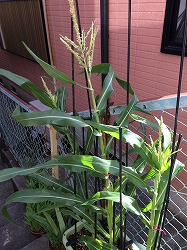 滋賀県の道の駅でトウモロコシの苗を売っていたので買ってきました。深い目の(45cm位)のプランターに3株植えました。本当はもっと深いほうがいいようです。もう雄花が出ています。やがて、雌花も出てきました。人工受粉もしてみました。ほどなく、身が膨らんできています。トウモロコシは雌花のヒゲの数だけ粒があるそうです。そのすべてのヒゲに人工受粉するのは難しく、触ってみると所々膨らんでいないところがあります。歯抜けのトウモロコシができそうです。、