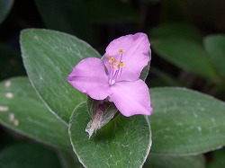 トラディスカンティア・シラモンタナツユクサ科の常緑多年草です。舌を噛みそうな名前で一度では覚えられません。いつも庭でひっそりと花が咲くのですが、名前がなかなか分からなくて、相当な時間を費やしました。トラディスさんという人の名前に由来するそうです。葉や茎の全体にベールを掛けたように産毛の様なものに覆われています。花は小さく可憐でピンクの一輪が可愛いです。乾燥気味に育てると産毛の様なものが増え、茎の間隔が短く育ちます。水を与えすぎると葉が大きくなり産毛も少なく、茎の間隔が伸びてしまいます。水の量で姿勢が顕著に変わります。玄関を出て一歩踏み出したところの足元にある鉢に花が一つ咲いています。毎日真っ先に目に入る花です。