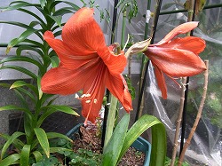 アマリリスは大きな花で人目を引きます。ヒガンバナ科の球根植物です。株分けして10鉢ほどあるのですが、今年花が咲いたのは一株だけでした。葉が4枚育つごとに花芽が分化するとか。そういえば他の鉢は葉の成長が悪かったですね。葉の一部が赤くなる赤斑病によく掛ります。