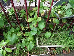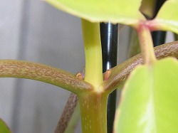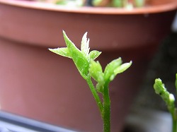 幻の花といわれるマザーリーフの花が咲きました。花が咲くのは2回目です。戸外に置いている為、冬越しが難しく、寒さのために新しく育てた株が全滅したり、冬の寒さ対策に苦労します。昨年末頃に花芽が出現し、翌年には立派な花が見れると期待されました。この時苗は元気だったのですが、成長が止まりだし、茎の節の間隔が短くなり、葉が縮んでしまうようになりました。このようになった時、根元の方を見ると、茎の表面がズルズルとなって正常ではありません。この症状が出たときは茎を切り戻して鉢に差し込んでおきます。そうすれば節から新しい根が生えてまた元気になります。切ったところを観察すると、導管部分が木質化して根から水分を葉に上手く運べていない状態であったり、導管が良くても周りの篩管がダメになって葉から根の方へ養分が上手く流れない状態になっています。切り戻すという荒治療をするのですが、花芽が付いた株で行うのは初めてなので花はあきらめました。夏になってやっと花芽が膨らみなんとか花が咲きそうです。株の高さは60センチもありません。1mを越す背丈にならないと花芽が付いてこないので妙な株になりました。やがて袋状の底が割れて花が伸びてきます。イカがぶら下がっているような奇妙な花です。このような感じで中から花が出てきます。もう一つの株はさらに背丈が低くなり40センチばかりしかありません。花の数も少なかったのですが、少し早く咲ききりました。完成品がこの姿です。他の鉢も全て切り戻しをしなくてはならないようになりましたが、根付いたようで、夏になって元気を取り戻してきました。順調に葉が成長しています。秋になればまた冬の寒さ対策を考えなければなりません。