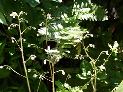 ユキノシタは湿った半日陰地の岩場などに自生する常緑の多年草です。約30センチほどの茎を伸ばし沢山の花を咲かせます。上の3枚が小さく下の2枚が長い5弁の人型の花が咲きます。沢山の花が風に揺れていると凧が舞っているように見えます。今年も花が咲きましたが、少し花が小さいように思えました。蔓のようなものを伸ばして土に触れると定着し、どんどん増えていきます。昔から民間薬として用いられ、葉は食用にもなるそうです。てんぷらにすると美味しいそうですが、まだ食していません。
