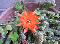 ビャクダンの花が咲きました。ビャクダンと言っても香木のビャクダンではありません。サボテンの仲間のビャクダンです。平成11年の秋に数本のビャクダンを貰いました。花が咲くことなど気にせずに鉢に植えたところ、今では鉢の土が見えなくなるほど増えて、3年目の今年初めて花が咲きました。クジャクサボテンの花を小さくしたような赤い花で、小さいですがしっかりとサボテンンの仲間の特徴ある花です。今年は3輪でしたが、来年はもっと咲くでしょうか。
