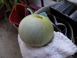 今年プリンスメロンの苗を買って鉢植えで育ててみました。3個目のプリンスメロンが成りました。大きさは大きめのミカンといったところでしょうか、重さは288gありました。先の2個は300gを超えていたのでやや小振りになります。先の2個はいびつな形でしたが今回は上手く丸い形になりました。二つ目の実が収穫できたときに今年はもう終わりだと思ったのですが、しばらくして株に元気が出てきて蔓がまた伸びだしました。1週間ほどするとまた花が咲き始めたので人工受粉したところ実が大きくなってきました。今年は暑さが続いているせいでしょうか、季節外れの様な時期にプリンスメロンができました。成長するのにもう少しかかると思っていたのですが、ヘタが千切れてしまったので収穫です。千切れた部分からは蜜が垂れていました。今回もネットで受けていたので上手く収穫できました。冷やして食べると甘くてメロンの味がしました。水分もたっぷりとあり、美味しかったです。来年も苗を見つけたらまた挑戦です。