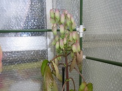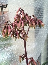 今年もマザーリーフの花が咲きました。毎年冬越しに苦労していますがなんとか花を付けてくれました。マザーリーフは葉を水に浸しておくと、葉の周囲から芽が出てきます。芽が3センチ~5センチ位に伸びてきたら鉢に移植します。夏場には良く成長し、翌年の夏を順調に越せば、背丈が1mを越すようになると花芽が出てきます。早ければ育て始めて翌年の冬に花芽を見ることができます。花芽が出始めて花が咲くまでに数カ月掛りますので気長に待ちましょう。花は咲き始めると結構長い間花が楽しめます。煌びやかな花ではありませんが、趣のある花です。毎年冬越しで苦労して、寒さで株が弱ってしまうので委縮した感じで花が付きます。本来ならば花茎ももっと伸びて花のバランスも良くなるのですが、戸外で育てているので少し無理があるようです。今年も5株が元気に育っています。うまくいけば来年も花が咲くかと思います。