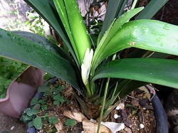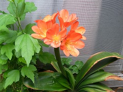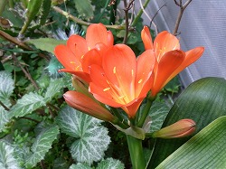 君子蘭はランと名が付きますが、ランの仲間ではなくヒガンバナ科の植物です。花芽は夏の間に形成されるそうですが、10度以下の低温に一定期間置いておかないと花が咲きません。一般の君子蘭に比べ、だるま君子蘭は葉が肉厚で短く、ずんぐりした感じです。この君子蘭は今年初めて花が咲きました。花の数は7個つきました。前に育てていた君子蘭が寒さのせいで枯れてしまったため、小さな苗を買ってきて8年程してやっと花が咲きました。今年こそ咲くかと毎年楽しみにしていましたが、冬の低温で葉が枯れてしまうことを何度も繰り返し、今年はやっと冬越しが上手くいったのか花を付けました。