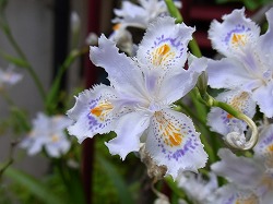 シャガは中国原産のアヤメ科の帰化植物です。アヤメの様な花で白色の中に濃い紫とオレンジ色がアクセントとなった綺麗な花を咲かせます。人の入っていない場所では見かけないとも言われています。山の中で見かけることがあれば、かつては人が住んでいたのではないでしょうか。種を付けることが無いので、花後そのままにしていても株が弱るということは無いそうです。株分けで簡単に増やせます。