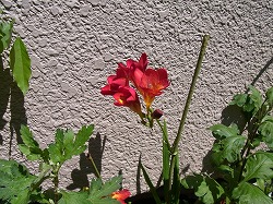 フリージアはアヤメ科の花で南アフリカ原産です。秋植え春咲きの球根植物です。花が咲くと香水の様ないい香りがします。側を通るとフッと香ります。昨年は前年に掘り起こしていた球根を植えるのを忘れていたので、12月になってあわてて鉢に植えましたが、翌春は葉が伸びるだけで花は咲きませんでした。今年はそのままにしていたら弱々しく葉が伸びてきたのですが、花はあまり期待していませんでした。4月の終わりころから花芽が伸びだしてきて花が咲きました。でもどことなく弱々しい咲き方です。株に勢いが無いようです。もっと栄養が要るようですね。