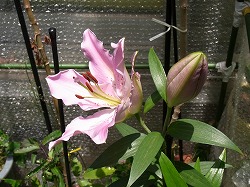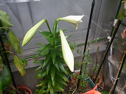 テッポウユリは百合の中でも大型の花が咲き、とっても香りがいい花です。我が家でも毎年咲いてくれます。今年は花芽が付いたのは一株だけでちょっと寂しい感じです。でも3個の花が付いて大きく咲きました。側を通るといい香りがします。ユリの香りは精神安定にいいそうです。数が多いと少し鼻にきつく感じますが、フッと匂うといい香りです。