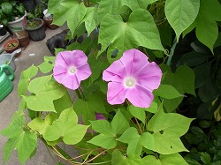 夏といえばアサガオ。夏には欠かせない花ですね。去年のアサガオの種が良く採れたので、この夏に全部蒔いてみました。芽が出てくると元気なのを残して間引きしなければならないのですが、間引きするとかわいそうになるので、いつもの通り伸びるに任せた育成です。一つの鉢に沢山芽が出て、放っておくと自然に淘汰され、元気な芽がどんどん伸びてきます。成長は早く、毎日のように誘引しないとあらぬ方向に蔓が伸びてしまいます。案の定隣の鉢にいつの間にか蔓が伸びて絡んでしまい、隣同士の鉢が移動できなくなってしまいました。去年は三種類の色を楽しんだのですが、今年の色はピンクの花ばかりです。何故?紫の花の種もあったはずなのに、見事にピンクばかりのアサガオとなりました。なかなか花芽が見えず、やきもきしましたが沢山の花芽が出て、順番に花が咲き毎日楽しめました。今年の種は大きく育っているようなので来年もアサガオが楽しめそうです。