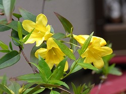 カロライナジャスミンが咲きました。芳香の強い白い花のハゴロモジャスミンとは属する科が違うようです。ハゴロモジャスミンは中国南部原産のモクセイ科の花ですが、カロライナジャスミンは北アメリカ南部原産のマチン科に属する花です。ラッパ型の黄色い花が咲きます。ジャスミンティーに使われるジャスミンとは全く別物の植物で、花、茎、根、葉の全てが有毒らしいので間違えてハーブティーなどにしてはいけません。我が家のジャスミンは古い鉢植えで毎年あまり花が付きません。剪定の仕方が悪いのでしょうね。