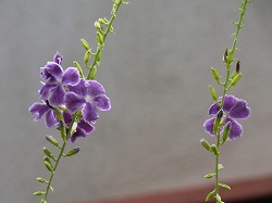 もう古株になるデュランタタカラヅカ、毎年花を咲かせてくれます。小さな苗を買ってきて成長と共に鉢を大きくしていったら、今では2mを超える高さになってます。強い風が吹く度に頭でっかちの木は倒れてしまいます。伸びすぎないように毎年伸びた枝を剪定しますが、コツがあるようで、へたすると翌年の花数が減ってしまいます。今年の花数は少ない方でへたな剪定の結果です。ちょうど大きな虫が見つを吸いに飛んできました。花は紫色の小さな花で白い縁取りが綺麗な花です。