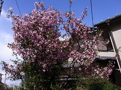 毎年桜の花が咲くころにハナカイドウの花が咲きます。蕾の頃はピンク色が濃いのですが、花が開くと桜の花のように薄ピンク色でとてもきれいです。花の形も色も桜の花によく似ているので間違われる方も多いようです。咲く前には蕾がサクランボのように見えます。冬の間、枯れ枝のようですが、3月になって暖かくなってくると蕾が急に成長してきて、日に日に蕾の成長が分かります。