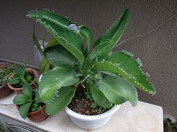 今年の夏の初めに小さな子宝草を貰いました。子宝草はその名の通り、子株を付けて爆発的に増えていきます。小さかった株もどんどん大きくなり、葉の窪みに次々と子株が出てきます。倍々ゲームどころではありません。この株は落ちた子株が大きくなったものです。最初に貰った株もこのくらいの大きさでした。この子株が周囲に落ちて、また成長してきます。この子宝草はマザーリーフと同じ様なものですが、大きく違うところは、葉の厚さが違います。子宝草の方が暑く、マザーリーフの方が薄いです。またマザーリーフは落ちた葉に新しい芽が出てきますが、子宝草は葉が落ちなくてもそのままに葉の窪みにクローンのように子株が付きます。子株が沢山付く様は葉に飾りが付いたように見えます。成長するとマザーリーフと同じような花が咲きます。葉が厚い分、冬場の温度管理はシビアかもしれません。今年はマザーリーフと子宝草の花を咲かせることに挑戦です。