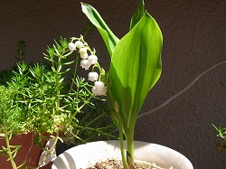 スズランが咲きました。白くて小さい可憐な花です。スズランはユリ科の花で、別名キミカゲソウ(君影草)とも呼ばれています。流通しているスズランはドイツスズランが多いそうで、英名Lily of the valley(谷間の百合)と呼ばれるそうで、和名も英名もなんとなくロマンチックな名前ですね。今までは花が付いても一輪だけとか二輪だけとか寂しい咲き方でしたが、今年は沢山の花が付きました。花後気づきましたが、花が散った後葉が少し大きく成長します。来年に備えて太陽を吸収し、球根に栄養を貯めるようになっているのでしょうね。