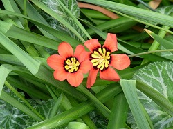 スパラキシスは南アフリカ原産の球根植物です。我が家の花はオレンジ色の花びらで、中心部が黒と黄色があるトリカラーと呼ばれる色です。細長い葉なので弱々しく感じますが、春になると芽を伸ばし、やがて細長い花茎が出てきます。見ため弱々しいのですが、花が咲くと一際目立つ花です。毎年花数は少ないですが咲けば存在感を示しています。