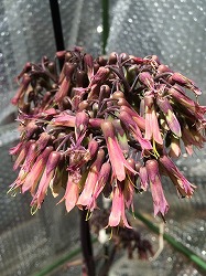 今年も子宝草の花が咲きました。昨年10月に簡易な温室を作り、冬に弱い鉢を中に入れてそのままにしていたところ、3月になって中をのぞいたら花が咲いていました。温室に入れるときには花芽の兆候は見られなかったので、今年は花はダメかなと思っていました。厳しい寒さが少なかったのかもしれません。マザーリーフの花よりは小ぶりに思います。