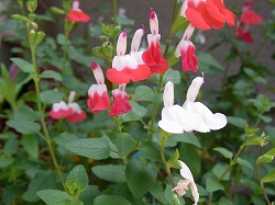 チェリーセージはアメリカ南部原産のシソ科の花です。道端で咲いていたものを切って持ち帰り、挿木にしたものが根付いて毎年花を咲かすようになりました。この花はホットリップスという種類のチェリーセージです。赤と白のツートンカラーの色合いが人目を引きます。気温などの条件によって花の色が変わるそうで、気温の高い時には赤色、低い時には白色になるそうです。我が家でもツートンカラーに混じって赤一色の花や白一色の花がちらほらと咲くことがあります。花の形といい、色の組み合わせといい、見てて飽きない花です。