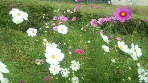 墓参り、草刈りに実家に帰りました。田舎は今コスモスが満開です。色とりどりでとてもきれいです。コスモスはすがすがしさを感じます。これはアケビです。山にいっぱいありました。アケビはゼリーのようなものですが、種がいっぱい入っています。