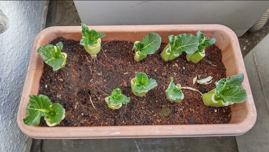 バジルは土に移したら半分くらい枯れちゃいました。素人なのでそういうこともあるかとミニトマトは5粒が少しずつではありますが育ってます。まだ小さいので少しずつ。。。一番うまくいってる小松菜。近所の八百屋さんでは根付き小松菜が大袋で大量に売っているので、ザクっと根元を切るのではなく、中の小さな葉っぱを残すように外葉をむしるスタイルにしました。これでまた水に浸けて少し成長したら土に植え替えようと思います