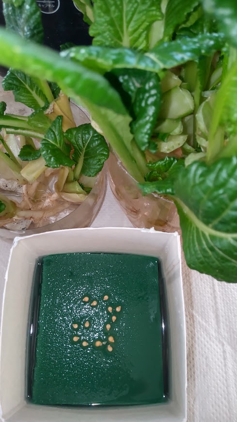 いつもカボチャの種は何かに使えそうと取っておきながら、少し時間が経つと捨ててしまっていたので、今回はそのまま土に埋めてみた。真ん中に植えているキャベツの芯の栄養になればいいなと思っていたけれど、一番カボチャの種が元気に育ってくれた。カボチャを育てるスペースなどないので、葉っぱを間引いておひたしと味噌汁の具にしてみた調理前のニオイは美味しくなさそうなニオイ。おひたしは少し苦みがあって、味噌汁の具としては全然気にならない葉物という感じでしたちょっと青みが欲しい時に使えそうですキャベツの芯からも緑色の葉っぱ出てきました~
