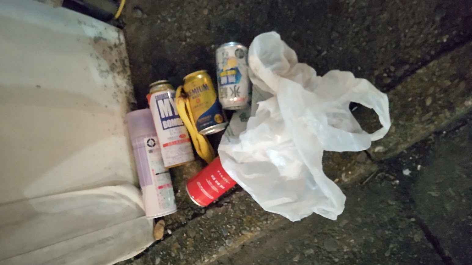 昼間のスプレー缶類の放置ゴミが気になって夜にもう一度行ってしまった。今回はそれだけ拾えばいいやと思いトングはなしでゴミ類は濡れていて手が予想以上に汚れてしまった もう開き直ってスプレー缶やら割れたコーヒーポットやら回収して集積場へ。途中で空き缶を何缶か拾って行ったら、飲みかけの缶コーヒーがこぼれて手がベトベトにとりあえずひと袋ゴミ出しできたのでよかったと思うことにします~少しずつキレイにしていきましょー