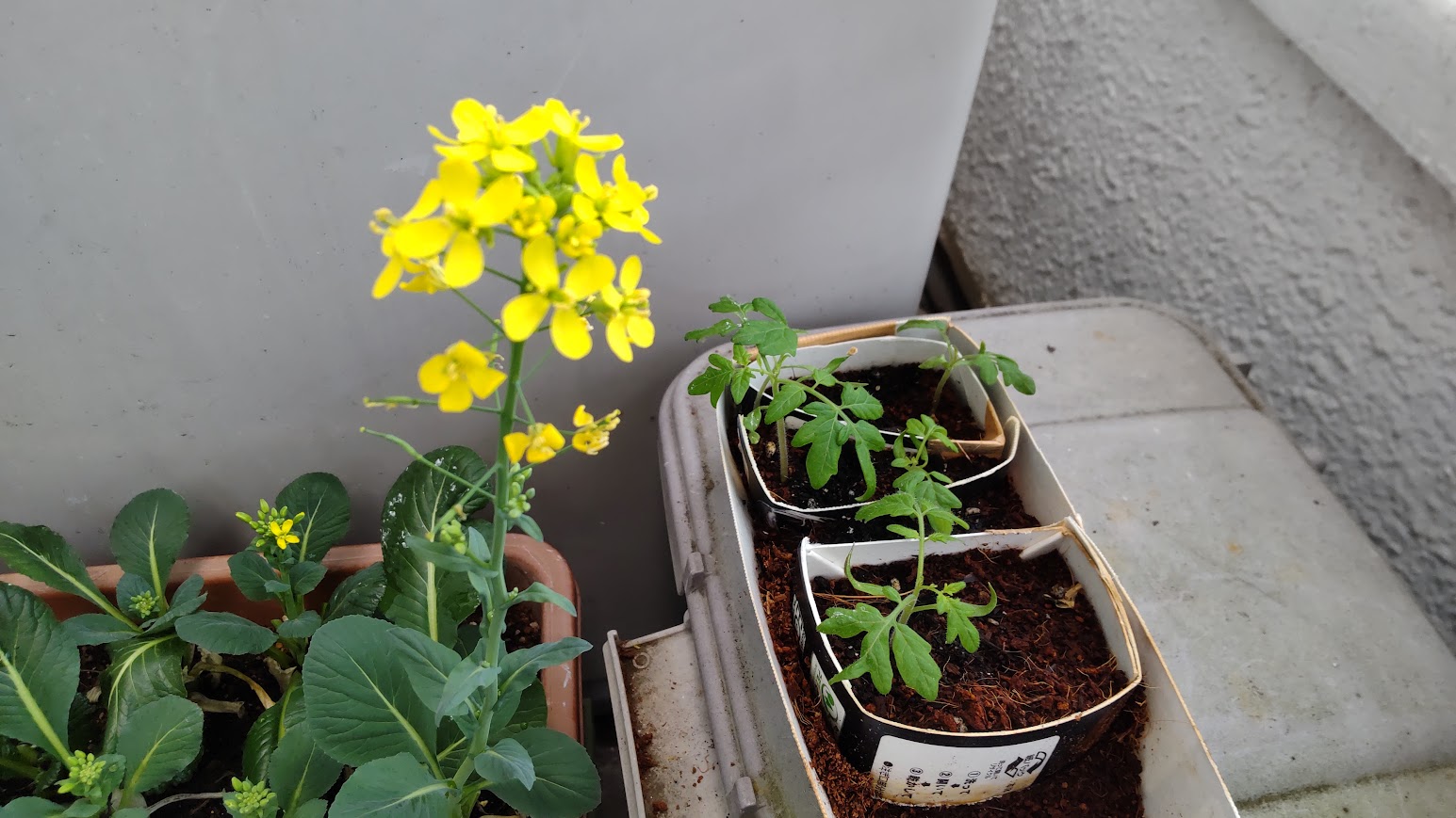 リボベジの野菜はイマイチ育ちが悪いけれど、小松菜に花がちょこっと。花が咲いてしまうと葉っぱは固くなっちゃうみたいですが、捨てる部分から育って花が咲くのはうれしいので、少し鑑賞しながら様子をみようかとミニトマトの種から様子見の芽は本当に少しずつ育ってます。ホームセンターの苗を見ると大分大きいのですが、本来は食べてしまっていた種からなのでまあ違いはしょうがないですね~ どうなることやらこちらも継続して様子見で
