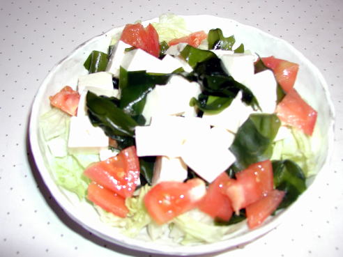 夜の10時を過ぎているというのに、主人から「腹減った」などという時差ボケしたようなメールがありました(ーー;)夕食を早い時間に食べたのでお腹が空いてしまったようです。『お腹は空いてるけど太るものは食べたくない』という主人の わがまま ご要望にお応えして ボリューム満点サラダ にしました。レタスとわかめと豆腐とトマト。これなら太るまい。。。主人がこれで満足して寝てくれることを願っています(~~;)※ピンボケでスミマセン(汗)